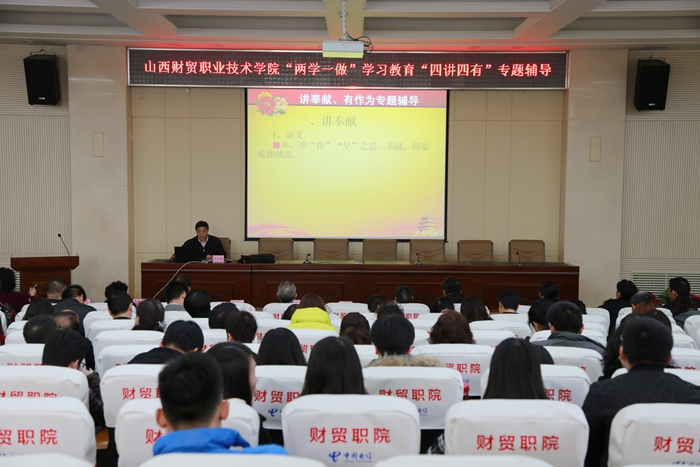 11月7日,我院在砺志楼大报告厅组织开展了“两学一做”学习教育“四讲四有”第四次的专题研讨学习。本次研讨主题为“讲奉献、有作为”。党委副书记李志慧进行集中辅导,全体党员参加了学习。