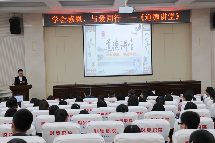 为弘扬中华民族的传统美德,倡导感恩励志、孝老爱亲的社会风尚,推动社会主义核心价值观和高尚道德理念内化于心,外化于行,引导我院师生自觉成为高尚道德的传播者和践行者。院团委于11月9日下午在励志楼大报告厅开展了主题为“学会感恩,与爱同行”道德讲堂。学院组宣部、院团委、各系分团委的相关负责人以及全体新生班团干共近300名师生参加了此次活动。