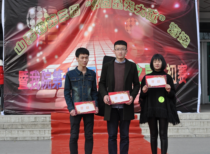 担任大赛的评委有院团委、各系分团委相关负责人及专职辅导员。各系选送的节目共有61个,其中,经贸系的雷森伟同学深情演唱了一首《童话》,并独奏了二胡名曲《赛马》,将奔腾嘶鸣的赛马场面表现得惟妙惟肖;信工系的李欣同学演唱的《爱你没错》和颇具地方特色的晋剧表演别开生面,有板有眼,旅游系的谢雨以一首《beautiful love》和动感十足的舞蹈成为大赛一道亮丽的风景,三名同学凭借实力唱功和出色的才艺表演得到了在场评委和同学们的一致好评,直接晋级,将代表学院参加山西省第三届校园星光大道的复赛。院团委书记马娟为晋级选手颁发了晋级卡,她在肯定选手精彩表演的同时也寄予了殷切期望,希望同学们为复赛认真做好准备,发挥自己的最佳水平,为学院增添新的光彩。