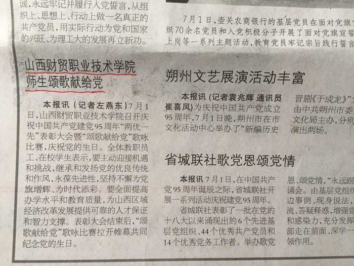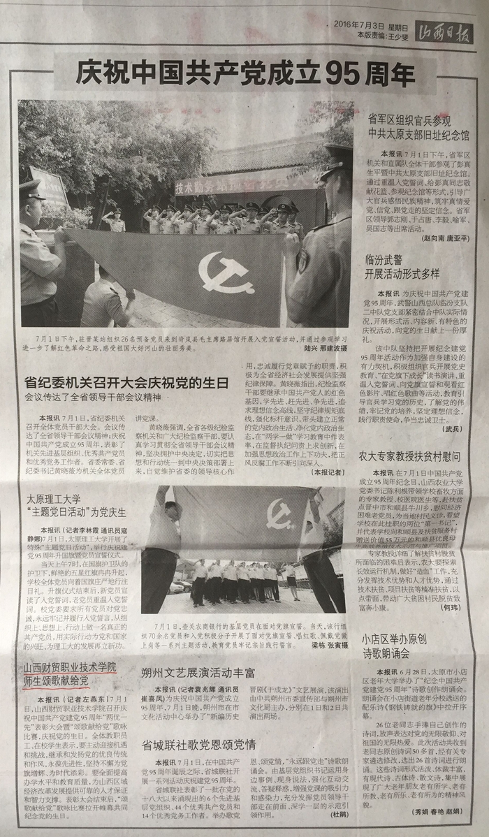 2016年7月1日,是中国共产党成立95周年的纪念日。我院在砺志楼大报告厅隆重召开庆祝中国共产党成立95周年“两优一先”表彰大会暨“颂歌献给党”歌咏比赛,表达我们对党的生日的热烈祝贺!也表达对每一位党员和全体教职工的亲切问候!本次表彰大会及歌咏比赛吸引媒体关注,山西电视台于2016年7月2日晚间新闻以“红歌嘹亮献给党”为题进行了报道;山西日报于2016年7月3日在第二版要闻“庆祝中国共产党成立95周年”专栏,以“山西财贸职业技术学院师生颂歌献给党”为题进行了报道。通过媒体报道,加大了对我院的宣传力度,塑造了我院的良好对外形象,提升了我院的社会知名度。