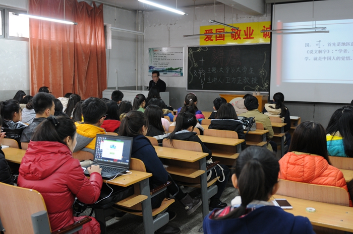 随后,卫教授从国学的含义、内容、现实意义及国学与国家和个人的关系作了进一步阐释。对于如何践行国学,卫教授认为应从几方面着手:一是品读经典,二是知行合一,三是坚持不懈。他指出,当代大学生应把学习国学,践行国学作为自己的历史使命,同时,卫教授对同学们提出了几点期望:学习知识,启迪智慧;继往开来,开创历史;吐故纳新,融汇中西;严于修身,谦谦君子;淡泊名利,持之以恒。