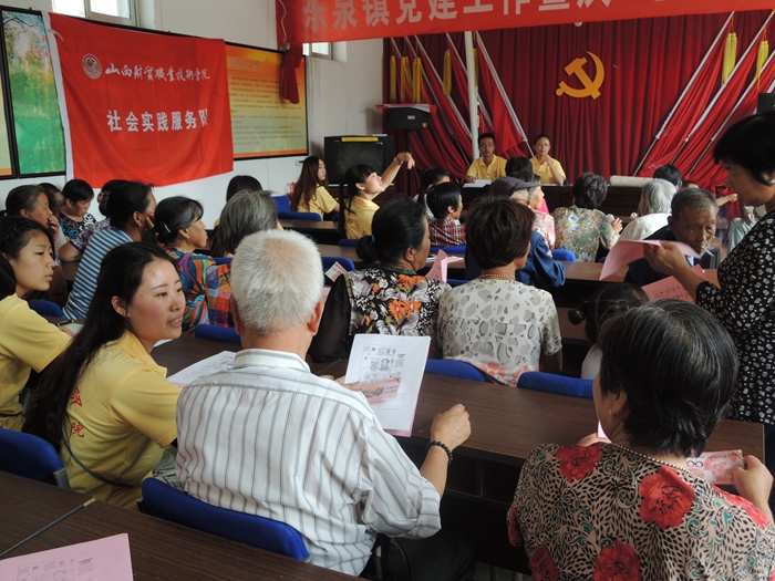 2015年7月20日,实践队正式启程,第一站首先来到平遥县东泉镇彭坡头村,该村位于平遥县城东南40华里的山脚下,全村227户,642口人,长住人口约300人,年龄超过50岁者占相当大的比重,村民收入主要以林果业、种植业为主。该村是我党在平遥成立的第一个县级抗日政府所在地,现已被县政府定为平遥县爱国主义教育基地。东泉镇书记郝金福、镇长雷军、副镇长张二兵,彭坡头村书记赵连寿、村长杨玉倡等人热情接待了实践队,并对此次活动给予了极大的支持和悉心的帮助,鼓励同学们多听、多看、多想、多问、多做,能够真正了解农村发展现状,更好地建设社会主义新农村。结合该村实际情况,队员们参观了革命根据地旧址、听老人们讲革命故事、整理了彭坡头村党支部档案、开办了“老年人防骗知识”讲座、教暑期归来的孩子们会计知识。期间,我院副院长张耀川专程来到彭坡头村看望了实践队员,与当地村民和队员们悉心交流,了解了队员们的实践情况,并鼓励同学们要勤动脑、勤动手,真正在此次实践活动中得到锻炼,有所提高。彭坡头村实践活动的时间转瞬即逝,当队员们与村民依依惜别时,村民们的淳朴、热情感染着同学们,同学们也用自己的专业知识、青春与热情为彭坡头村带去了新的生机与活力。