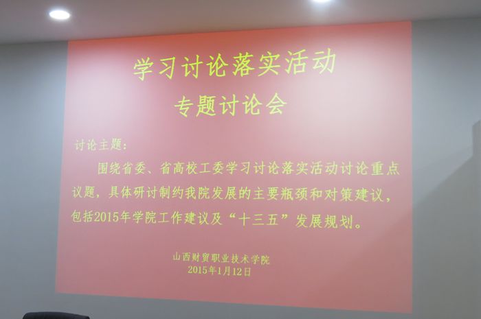 1月12日下午2:30,我院在砺志楼小报告厅组织学习讨论落实活动专题讨论会。讨论主题是:围绕省委、省高校工委学习讨论落实活动讨论重点议题,具体研讨制约我院发展的主要瓶颈和对策建议,包括2015年学院工作目标及“十三五”发展规划建议。省教育厅第三督导组对讨论会进行全程指导。我院领导班子、各部门主要负责人参加了讨论会。讨论会由党委书记邓光辉主持。