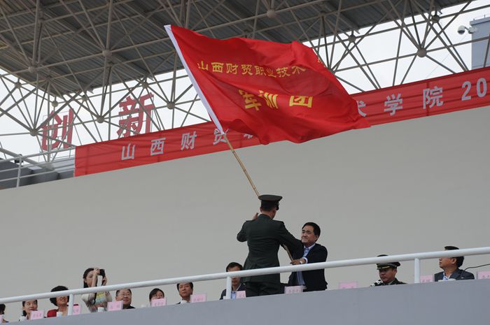 大会在雄壮嘹亮的国歌声中拉开帷幕,院长李晋平宣布军训干部任命名单并授军旗。伴随着庄严的乐曲,军训团长袁红亮接过军旗。