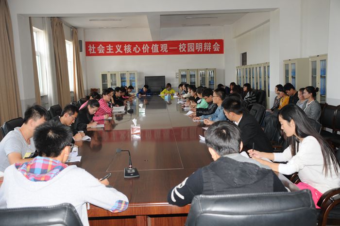 为深入开展培育和践行社会主义核心价值观活动,切实引导青年学生将社会主义核心价值观内化于心、外化于行,我院团委于2014年9月24日下午1:00—3:00在创新楼评估办会议室举办了“社会主义核心价值观——校园明辨会”。院团委书记马娟、副书记李海芳、张鹤老师、张媛老师以及院系团学骨干、各社团负责人共38人参加了此次活动。此次校园明辨会由院团委副书记李海芳主持。