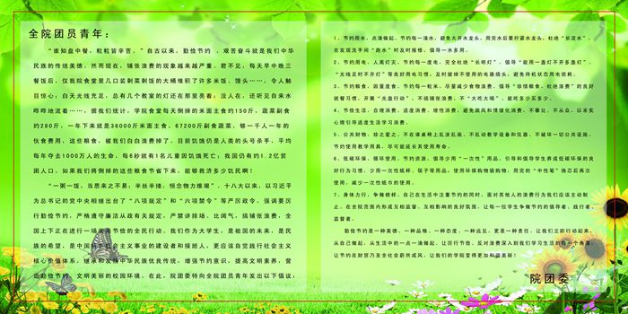 一粥一饭,当思来之不易;半丝半缕,恒念物力维艰。十八大以来,以习近平同志为核心的党中央相继出台了中央八项规定和“六项禁令”等严厉政令,强调要厉行勤俭节约,严格遵守廉洁从政有关规定,严禁讲排场、比阔气,搞铺张浪费,全国上下正在进行一场崇尚节俭的全民行动。我们作为大学生,是祖国的未来,是民族的希望,是中国特色社会主义事业的建设者和接班人,更应该自觉践行社会主义核心价值体系,继承和发扬中华民族优良传统,增强节约意识,提高文明素养,营造勤俭节约、文明美丽的校园环境。因此,院团委特向全院团员青年发出以下倡议: