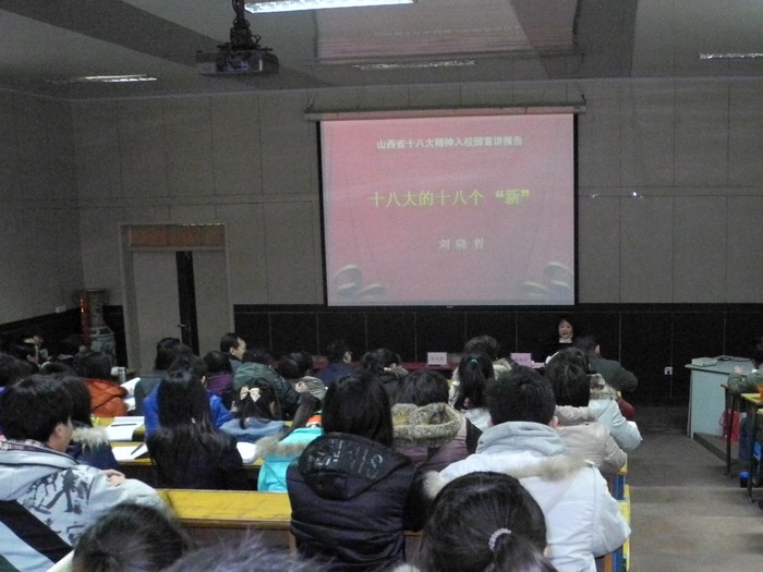 2012年12月27日下午2点30分省高校工委组织的“党的十八大精神进学校”宣讲团专家刘晓哲抵达我院解读党的十八大精神。全体党员、中层干部及部分学生认真听讲,在专家的解读下,全面准确的理解掌握党的十八大精神,增强推动教育事业科学发展的自觉性和坚定性。