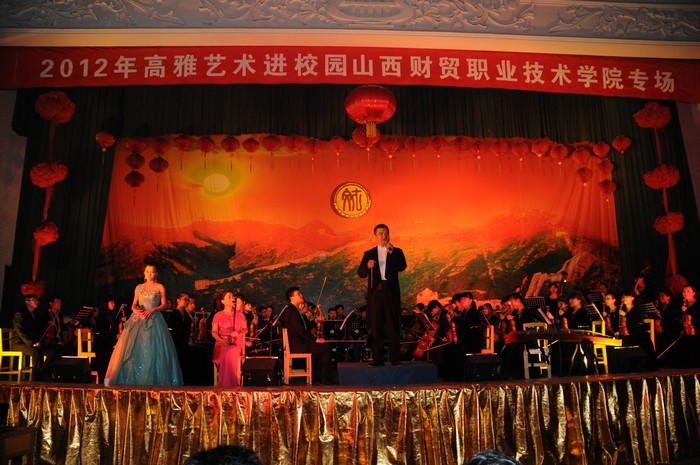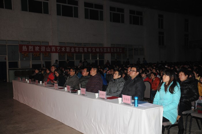 为提高我院师生的审美能力、创新思维,扩大同学们的知识层面,进一步推进高雅艺术进校园活动的有效开展,按照山西省教育厅《关于在全省普通高等学校开展2012年高雅艺术进校园活动的通知》的安排部署,2012年12月11日,我院特别邀请了山西艺术职业学院青年交响乐团在学院大礼堂进行了交响乐专场演出。院长牛白琳、副院长尤陶江亲临活动现场与全院1500余名师生共同聆听了这场高水准、高品位的视听盛宴。