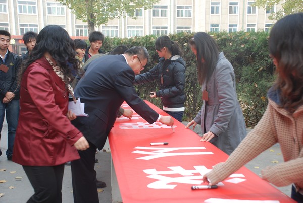 山西省工商行政管理局直销监管处处长郭新安和院团委书记马娟参加“防止传销进校园”现场签名活动