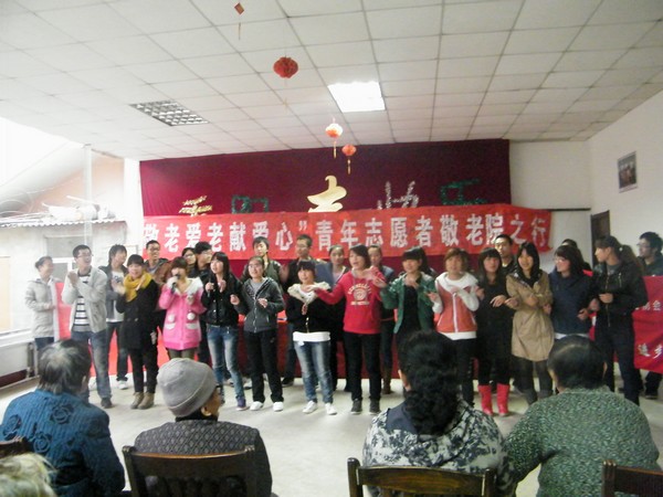 青年志愿者们带着全院学生的签名和心声,满怀热情来到敬老院,为老人们义务服务,陪老人们聊天,并献上了丰富多彩的文艺节目。整个过程气氛活跃,同学们用真诚的行动赢得了满院的笑声和掌声,为老人们平淡的世界里带去了歌声和欢乐,也带去了问候与关怀。