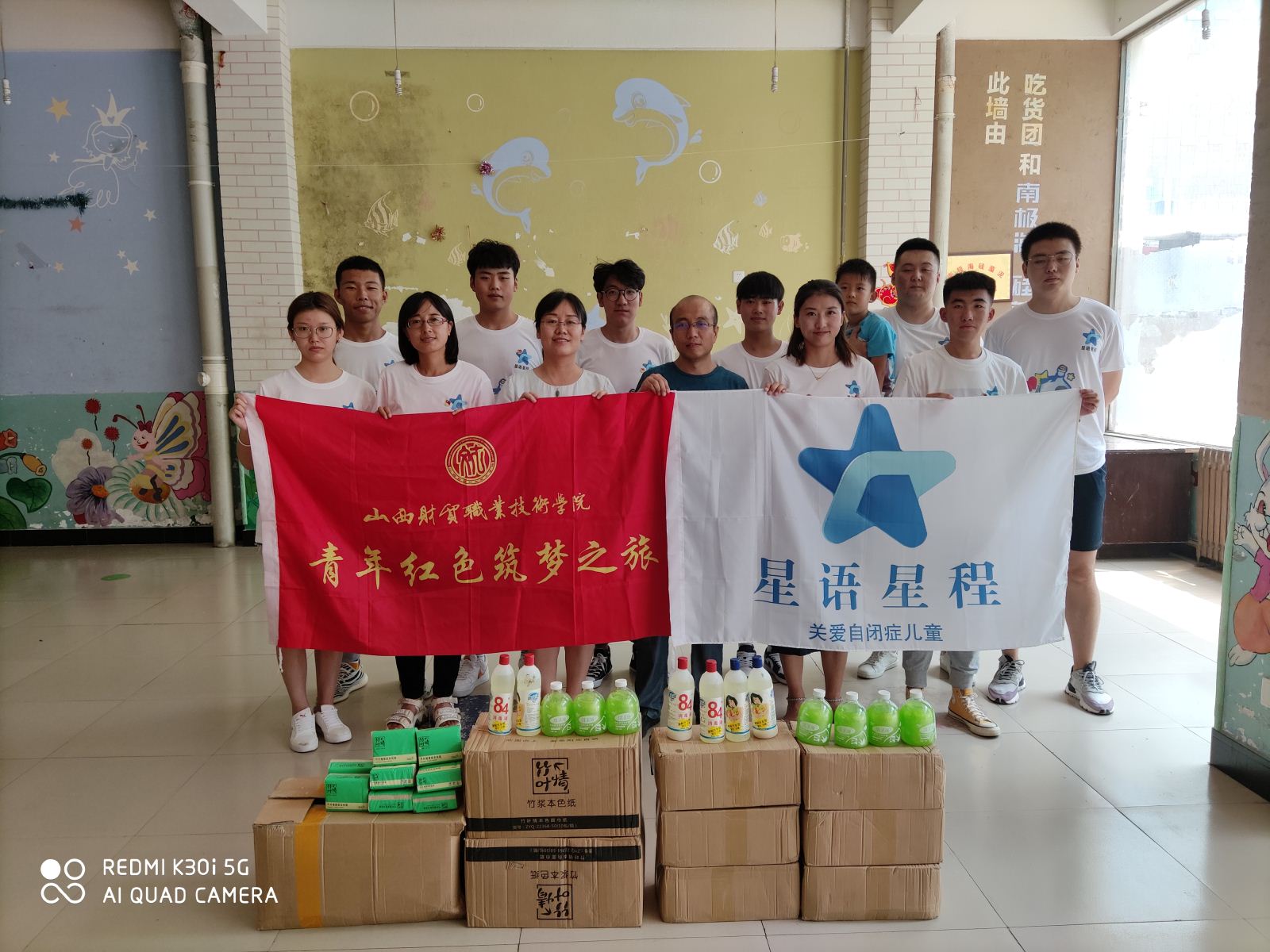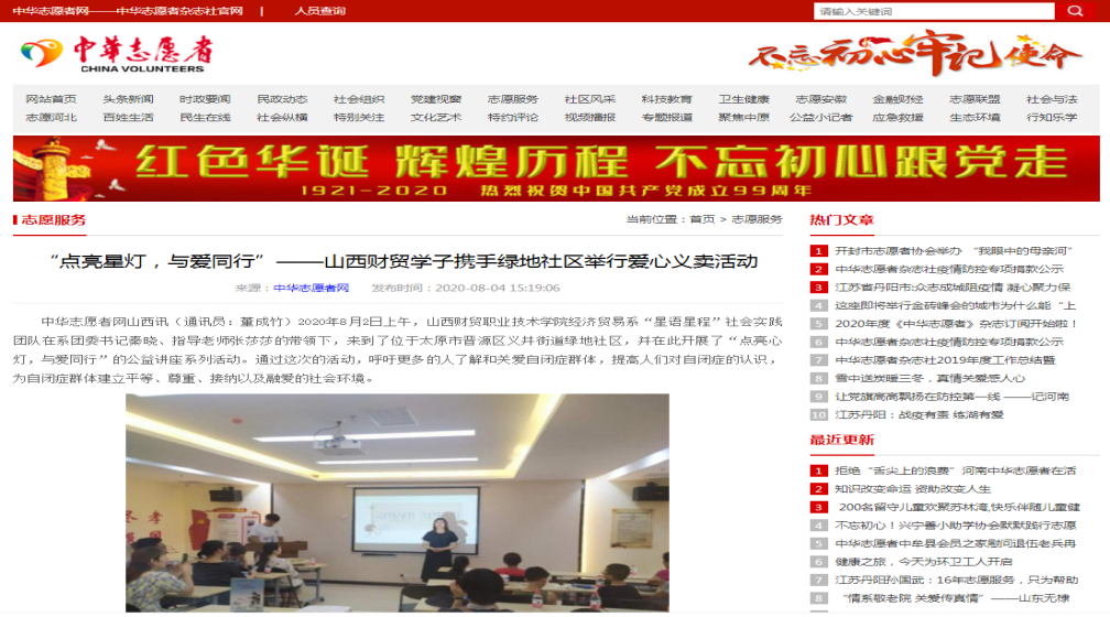 为引领广大青年学生深入学习贯彻习近平新时代中国特色社会主义思想特别是习近平总书记关于青年工作的重要思想,贯彻总书记视察山西重要讲话精神以及省委“四为四高两同步”总体思路和要求,践行社会主义核心价值观,为全省改革转型贡献青春力量。在疫情防控常态化形势下,山西财贸职业技术学院积极响应团省委的号召,认真组织开展以“青春兴晋”为主题的2020年暑期“三下乡”社会实践活动,本次活动学院领导高度重视,大力支持,学院团委精心部署,周密安排,制定了切实可行的活动方案,全院团员青年积极响应团委号召,积极投身于社会实践。经济贸易系团委,在系党总支和院团委的指导下,开展青年红色筑梦之旅专项行动,集中组织了“星语星程”关爱自闭症儿童暑期社会实践小分队,于2020年7月27日——8月3日,在太原开展了为期八天的志愿服务社会实践活动。同学们深入农村、社区、企业、自闭症康复中心、医院,开展了一系列走访、学习、调研、宣讲及志愿服务活动。实践务求实效、深化项目,目标精准、工作系统,内容丰富、反响良好,获中华志愿者官网报道。