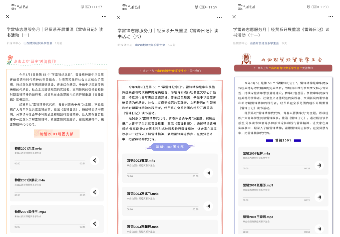 各系团委积极组织广大青年学生共读雷锋故事,重温《雷锋日记》,通过畅谈读书感想、分享读书体会等方式,让大家在真实故事中,感受雷锋精神,在见贤思齐中,把雷锋精神代代传承下去。