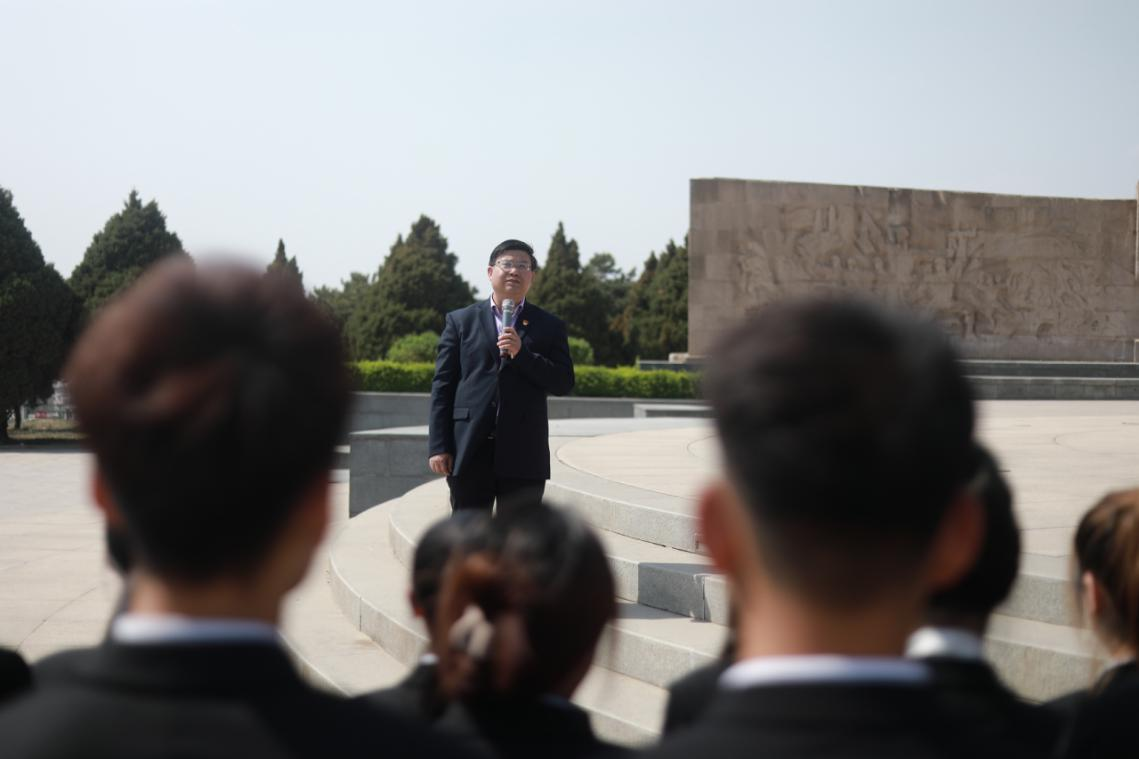 在徐向前铜像前,文化旅游系党总支书记葛建军同志现场讲党课,追忆当年革命岁月。他说,太原战役持续半年之久,解放军死伤4.5万人,7000多名烈士长眠于此,其中很多烈士连姓名都没有留下,他们用鲜血和生命换来了今天美好的生活,我们要继承革命先烈的遗志,让英雄精神激励我们继续前行。