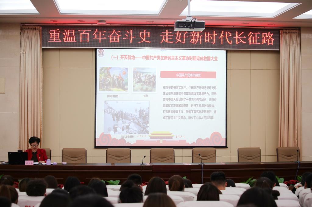 “中国共产党的历史是一部丰富生动的教科书。中国共产党在新民主主义革命时期完成救国大业、在社会主义革命和建设时期完成兴国大业、在改革开放和社会主义现代化建设新时期推进富国大业、在中国特色社会主义新时代推进并将在本世纪中叶实现强国大业,这四件大事铸就了中国共产党百年辉煌。”段文美院长首先详细讲述了中国共产党波澜壮阔的百年奋斗历程,指出中国共产党的百年历史,是用鲜血、汗水、泪水、勇气、智慧、力量写就的百年,是筚路蓝缕、披荆斩棘、艰苦创业、砥砺前行、充满艰险、充满神奇的百年,是苦难中铸就辉煌、挫折后毅然奋起、探索中收获成功、失误后拨乱反正、转折中开创新局、奋斗后赢得未来的百年,是一部党与人民心连心、同呼吸、共命运的历史,是一部践行党的初心使命的历史。