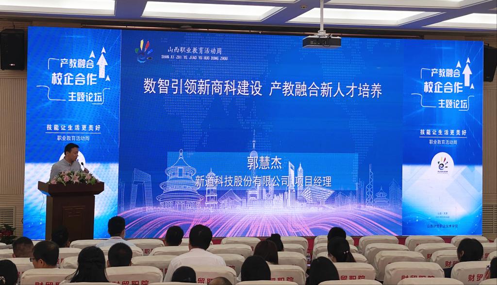 新道科技股份有限公司郭慧杰总经理就“数智引领新商科建设 产教融合新人才培养” 做了主题报告,郭总认为构建现代产业学院,是新时期产教融合着力点,并对数智产业学院四大职能九大任务与教师们做了详细的讲解。教育作为培养人才之本,需要在与产业融合中提高人才培养的质量。