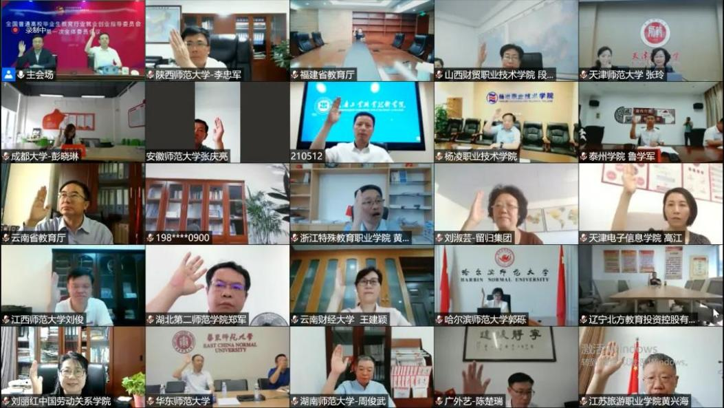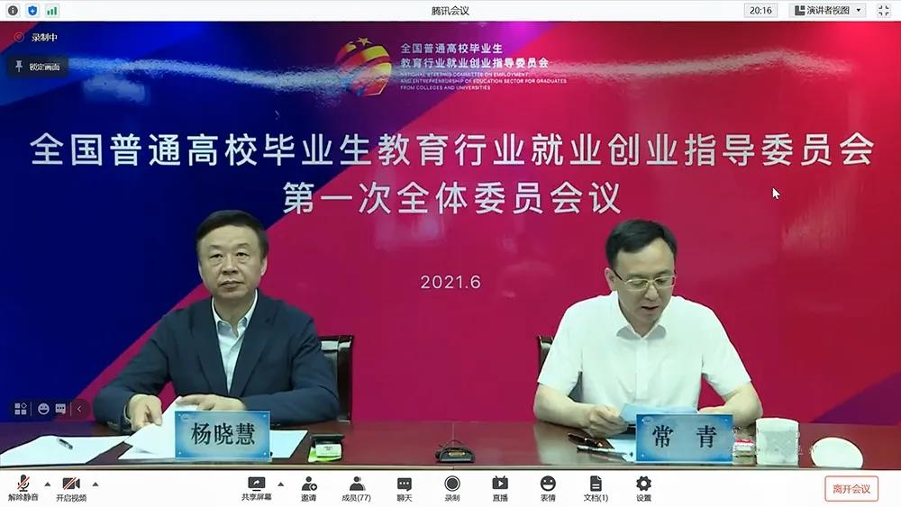 为深入贯彻党中央、国务院“稳就业”“保就业”决策部署,落实教育部全国普通高校毕业生就业创业指导委员会相关工作要求,6月23日,全国普通高校毕业生教育行业就业创业指导委员会第一次全体委员会议通过腾讯会议APP召开,会议主会场设在东北师范大学。教育部高校学生司司长王辉、教育行业就指委主任委员、东北师范大学党委书记杨晓慧出席并讲话,陕西师范大学党委书记李忠军、华东师范大学副校长戴立益、天津师范大学党委副书记宁月茹代表教育行业各地区指导组发言,来自全国各相关单位的共计70余位教育行业就职委委员和指导组成员参加会议。会议由教育行业就指委秘书长、东北师范大学副校长常青主持。我院段文美院长作为第一届全国普通高校毕业生就指委委员受邀出席会议。