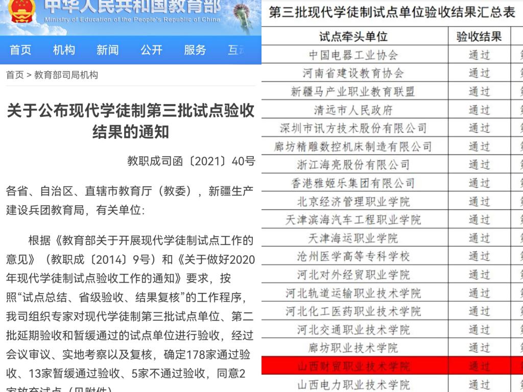 日前,教育部职业教育与成人教育司公布了《现代学徒制第三批试点验收结果的通知》,经试点总结、省级验收、教育部结果复核,我院通过教育部现代学徒制第三批试点验收,标志着学院现代学徒制人才培养模式改革取得重要阶段性成果。