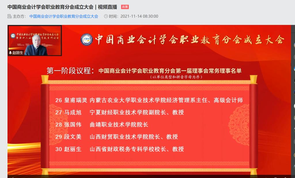 11月14日,中国商业会计学会职业教育分会成立大会暨第十六届职业教育改革研讨会在线上举办,来自全国五湖四海的财经职业教育院校、相关机构、企业、出版社等168所团体会员、328名个人会员、财会专家、教学骨干齐聚云端,共襄财会职教盛会。我院作为中国商业会计学会职业教育分会团体会员单位受邀参会,共话财经专业人才培养。