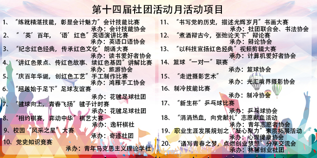向快乐出发,多彩的社团等待大家的积极加入;向未来出发,美丽的大学生活由我们共同创造。“传百年薪火,谱社团华章”第十四届社团活动月,因你更加精彩!