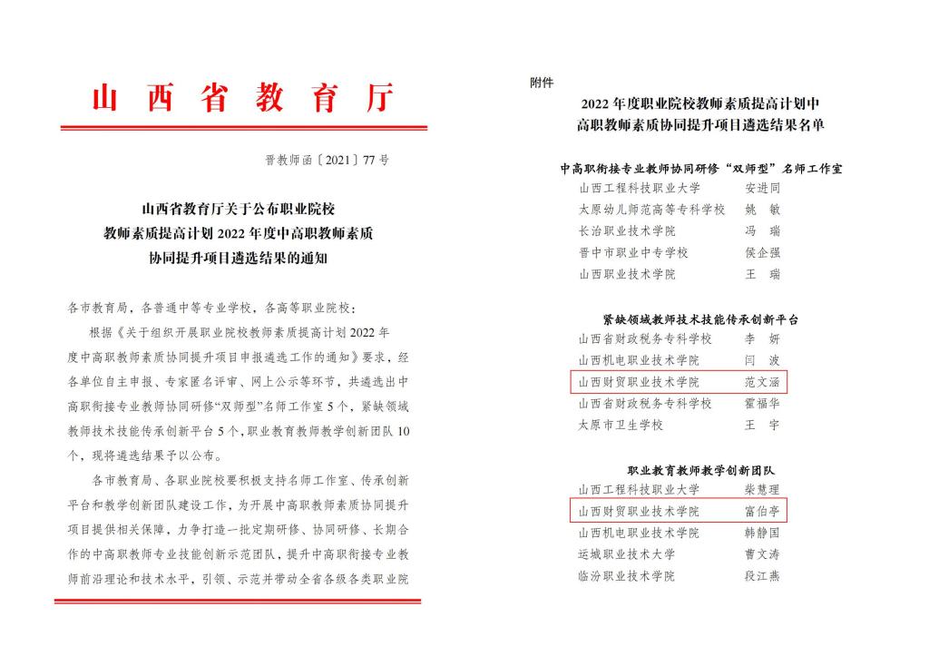 按照《山西省教育厅关于组织开展职业院校教师素质提高计划2022年度中高职教师素质协同提升项目申报遴选工作的通知》(晋教师函【2021】66号)文件要求,我院积极部署安排。相关部门任劳任怨、加班加点、日夜奋战,及时报送相关资料。经教育厅专家组评审、网上公示,我院“职业教育教师教学创新团队”项目和“紧缺领域教师技术技能传承创新平台”项目遴选成功。本次面向全省中高职院校共可申报三个项目分别为:中高职衔接专业教师协同研修“双师型”名师工作室 5 个、紧缺领域教师技术技能传承创新平台 5 个、职业教育教师教学创新团队 10个 。我院成功获批两个项目,在全省中高职院校中名列前茅,充分体现学院服务能力的进一步提升。两个项目在建设期内,财政将投入建设经费各20万元。