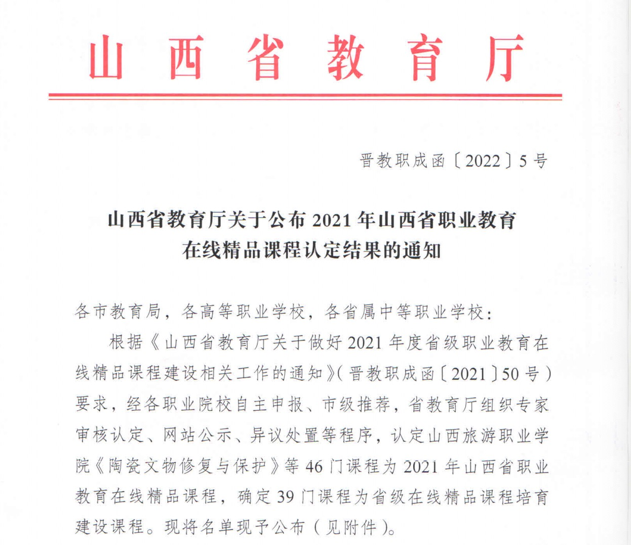 近日,山西省教育厅公布了2021年山西省职业教育在线精品课程认定名单(晋教职称函【2022】5号),全省共计46门课程入选。我院葛建军教学团队的《百变导游(现场模拟导游)》、梁越月教学团队的《装饰材料与施工工艺》以及张志宇教学团队的《导游带团》等3门课程位列其中,入选数量位居全省高职院校前列。