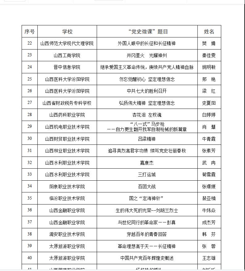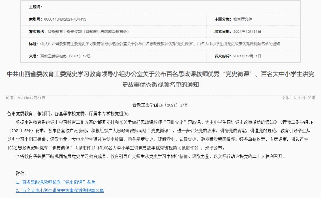 经过层层选拔,思政部选送的两项作品分别入选山西省“100名思政课教师优秀‘党史微课’”和“100名大中小学生讲党史故事优秀微视频”。