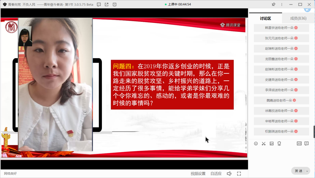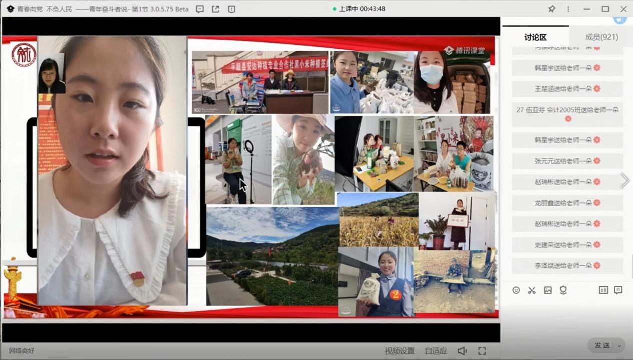 之后,分享会采用线上采访的方式,冯春老师视频连线王亚妮,在一问一答中,将王亚妮的奋斗故事与心得娓娓道来。王亚妮向同学们讲述了自己竞选村支部书记、村委会主任时的顾虑和原因,讲述了一个返乡创业青年成为村党支部书记、村委会主任的适应过程。她也向同学们介绍了她通过网络销售当地的优质农产品的创业项目,在保证质量的同时,也解决了部分妇女的就业问题。她用“资金短缺去贷款,人脉缺乏舍脸皮,夏天低头去流汗,严寒到处跑货源”四句话分享了自己最艰难时候的事情。从一开始的手指磨破,锻炼到最后的“铁汉子”,王亚妮背后的付出深深触动着同学们。一路走来,她坚信“好人有好报”,要做一个善良的人,善于发现世界的美好,遇到困难时要想着怎么去解决而不是放弃。她还提到,在校期间学生干部的经历让她有了强烈的责任感和使命感,对于后来的创业和村委工作都有很大的帮助。随后,她从学习、生活、工作等方面为学弟学妹们提出要敢于尝试、多学习、为社会发展作出贡献的建议。让我们深切的感受到这才是最美的模样,自信、阳光、正能量满满。说到未来,她感受到了那份沉甸甸的责任、沉甸甸的担子、沉甸甸的期盼,无论遇到什么困难,她都迎难而上、知难而进,用实际行动当好全村的“主心骨”,带领村民们共同打造“乡村振兴”的南坡样板,不辜负组织的信任和全村的期盼。