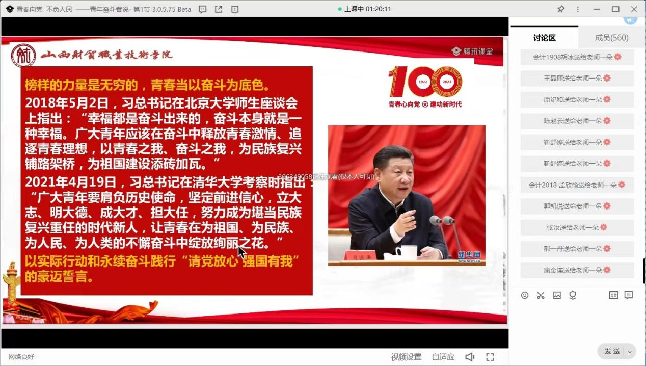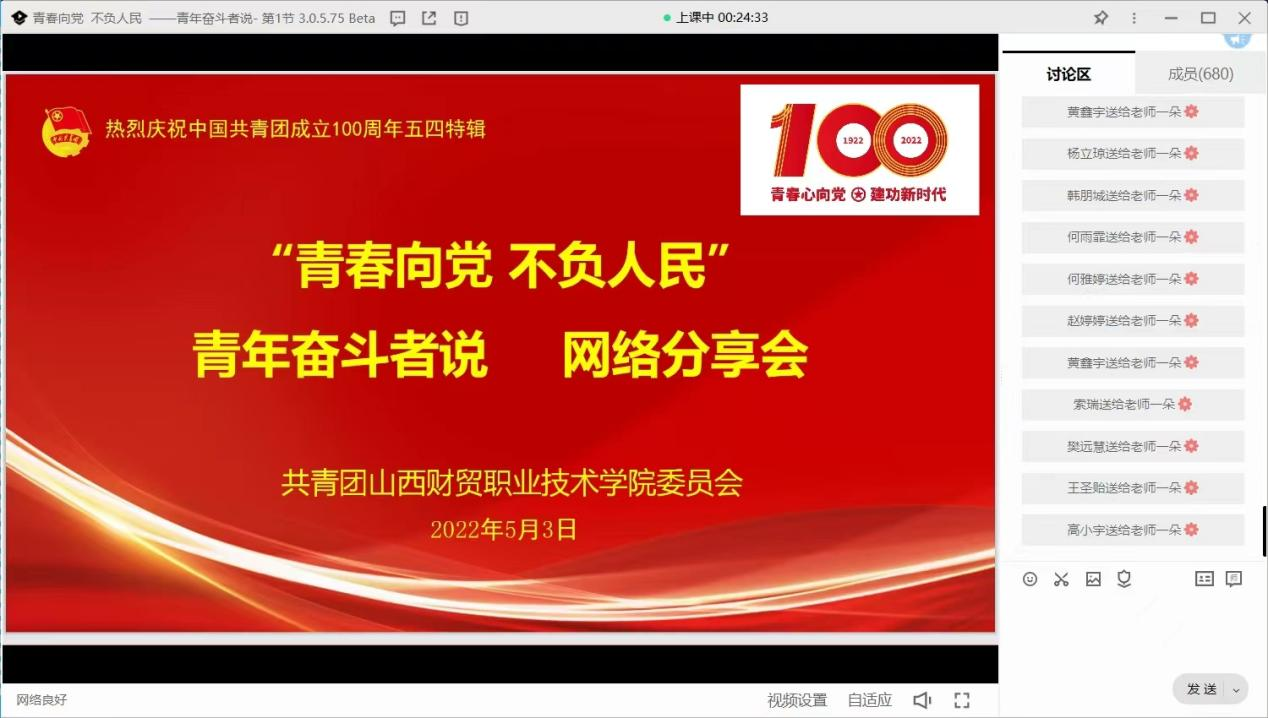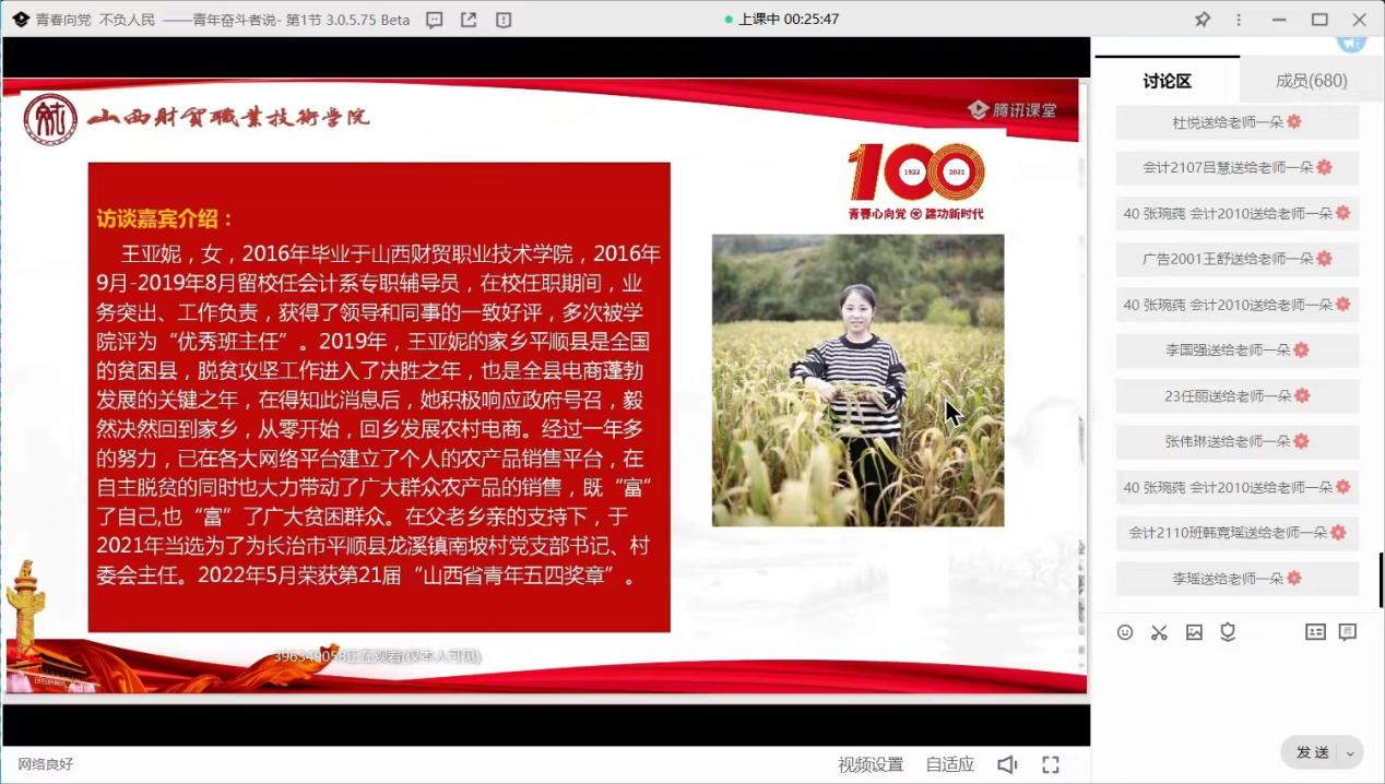五四青年节来临之际,为激励我院青年不负伟大时代、勇于筑梦追梦,激发我院青年永远跟党走、建功新时代的热忱情怀,2022年5月3日上午9:30,我院团委组织了热烈庆祝中国共青团成立100周年五四特辑:“青春向党,不负人民——青年奋斗者说”网络分享会。此次分享会邀请了我院优秀毕业生代表、第21届“山西省青年五四奖章”获得者王亚妮分享了其返乡干事创业的精彩奋斗故事,腾讯课堂线上观看人数近千人。分享会由院团委负责人冯春老师主持。