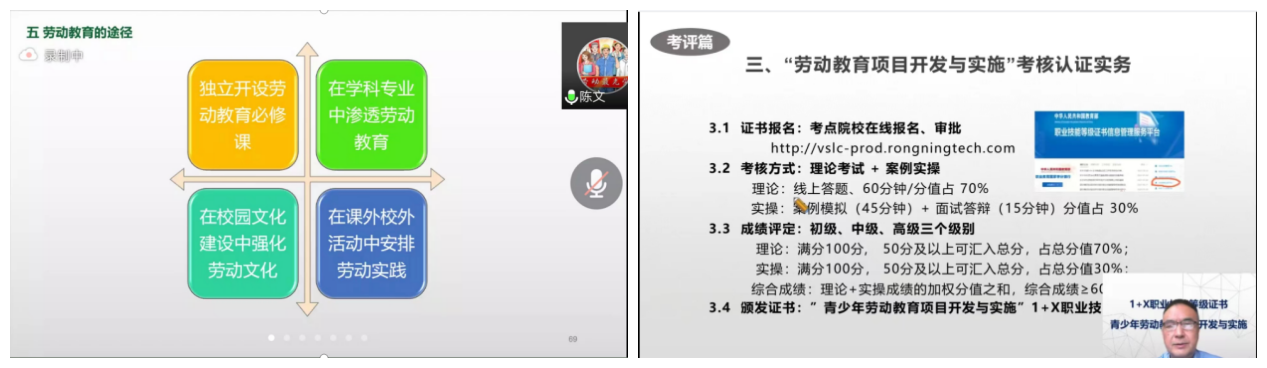 第二阶段由考评员王雪娟老师按照国家1+X“劳动教育项目开发与实施”职业技能证书师资证书考核要求,在标准不降、难度不降、内容增加的基础上,对其余9位参训老师进行1+X“劳动教育项目开发与实施”职业技能证书师资证书考核,9位老师以优异的表现全部通过了考核,为我院形成了校级1+X“劳动教育项目开发与实施”职业技能证书师资储备。