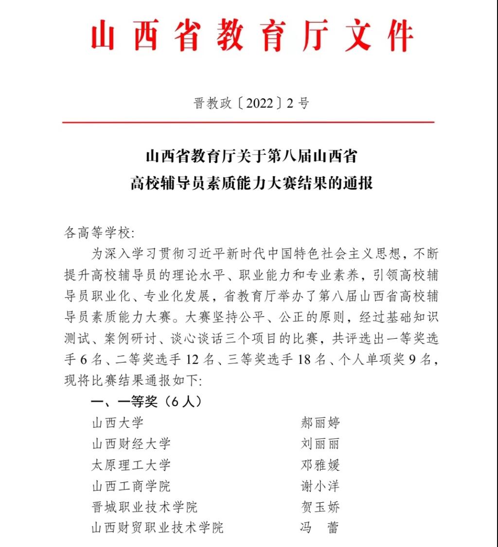5月16日至19日,由省教育厅主办、山西财经大学承办的第八届山西省高校辅导员素质能力大赛决赛正式开赛。受疫情影响,大赛首次采用“选手线上公开展示”+“评委线上同步评审”的方式进行,我院选送的辅导员冯蕾老师参赛,与来自全省56所高校的69名辅导员参赛选手同台竞技,比拼理论水平、职业能力与专业素养,并最终取得一等奖的优异成绩,为学院争得了荣誉,充分展现了我院辅导员的精神风貌和业务能力。
