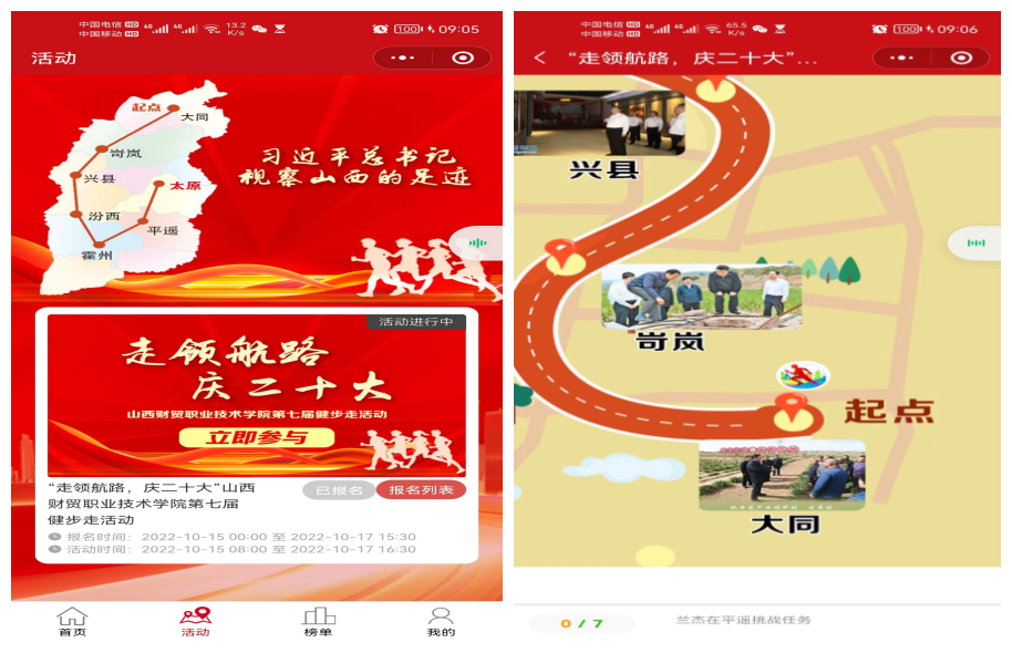 活动紧紧围绕“走领航路,庆二十大”主题,“云”走领航路、“时”宣二十大、“守”好职教心,通过“健步+视频+学习+答题”方式,运用线上小程序设定健步走行走路线、所经站点与党史知识题库。活动采用线下步数与线上步数同步,学习党史知识与健步走活动相结合,将线下体育活动与线上数字优势相结合的方式进行。线上小程序的地图中清晰重现了习近平总书记历次视察山西路线,起点为“大同站”,中途设岢岚、兴县、汾西、霍州、平遥,终点为“太原站”,共七个站点。全体教职工在规定时间线下完成6000步、线上按照预先设定的站点顺序每个站点一道题,共完成七个站点七次答题任务。