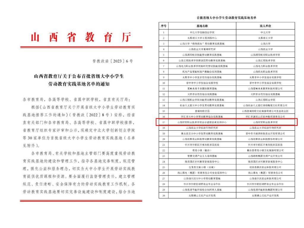为贯彻落实《中共山西省委、山西省人民政府关于印发<山西省关于全面加强新时代大中小学劳动教育的若干措施>的通知》(晋发〔2021〕68号)精神,根据《山西省教育厅关于开展省级大中小学生劳动教育实践基地推荐工作的通知》(晋教政〔2022〕8号)要求,我院统筹全院劳动教育实践资源,认真对照省教育厅推荐条件,科学评估申报资质、配套设施、师资队伍、安全防控等相应内容,优中选优上报了会计虚拟仿真实训中心参加省级遴选,在激烈竞争中脱颖而出,荣登首批省级大中小学生劳动教育实践基地公示名单。