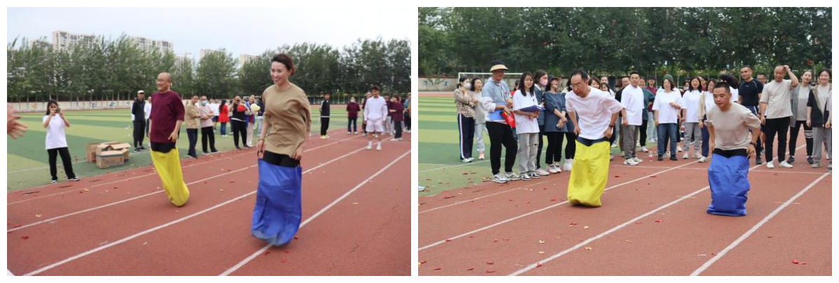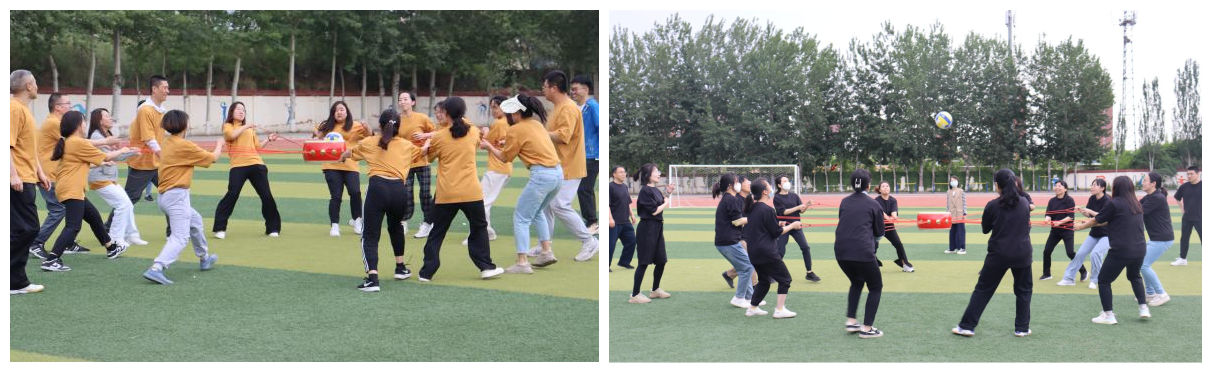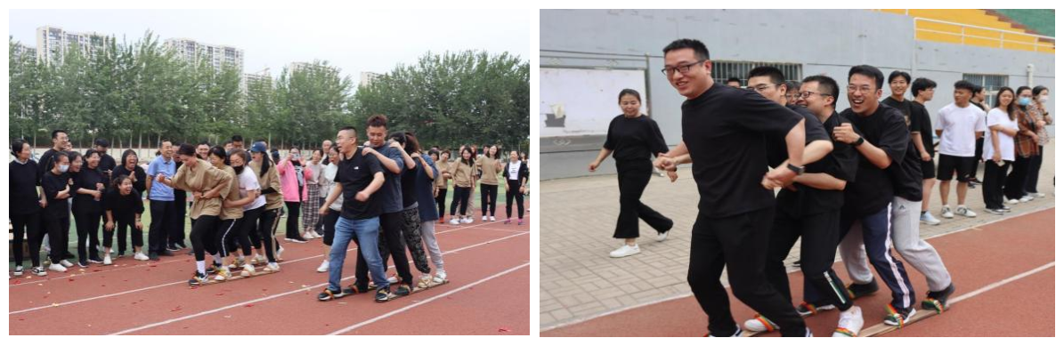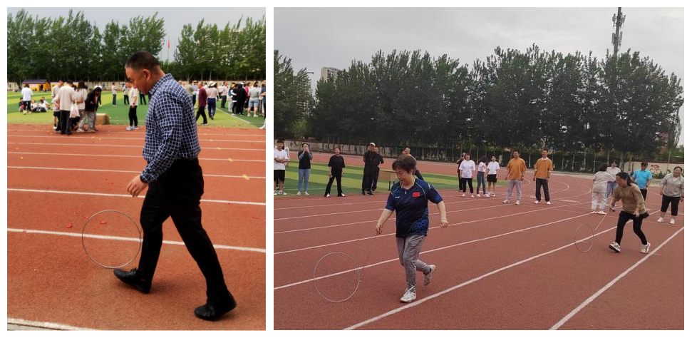 50M×6人滚铁环、吹气球、同舟共济四人板鞋赛跑、同心协力团队击鼓比赛中,老师们配合默契,行动敏捷,体现了团结协作的精神。“15米往返袋鼠跳答题接力赛”比赛更是将运动、娱乐与“学习贯彻习近平新时代中国特色社会主义思想主题教育”活动结合起来,在运动中、娱乐中促进主题教育学习、检验主题教育成效。