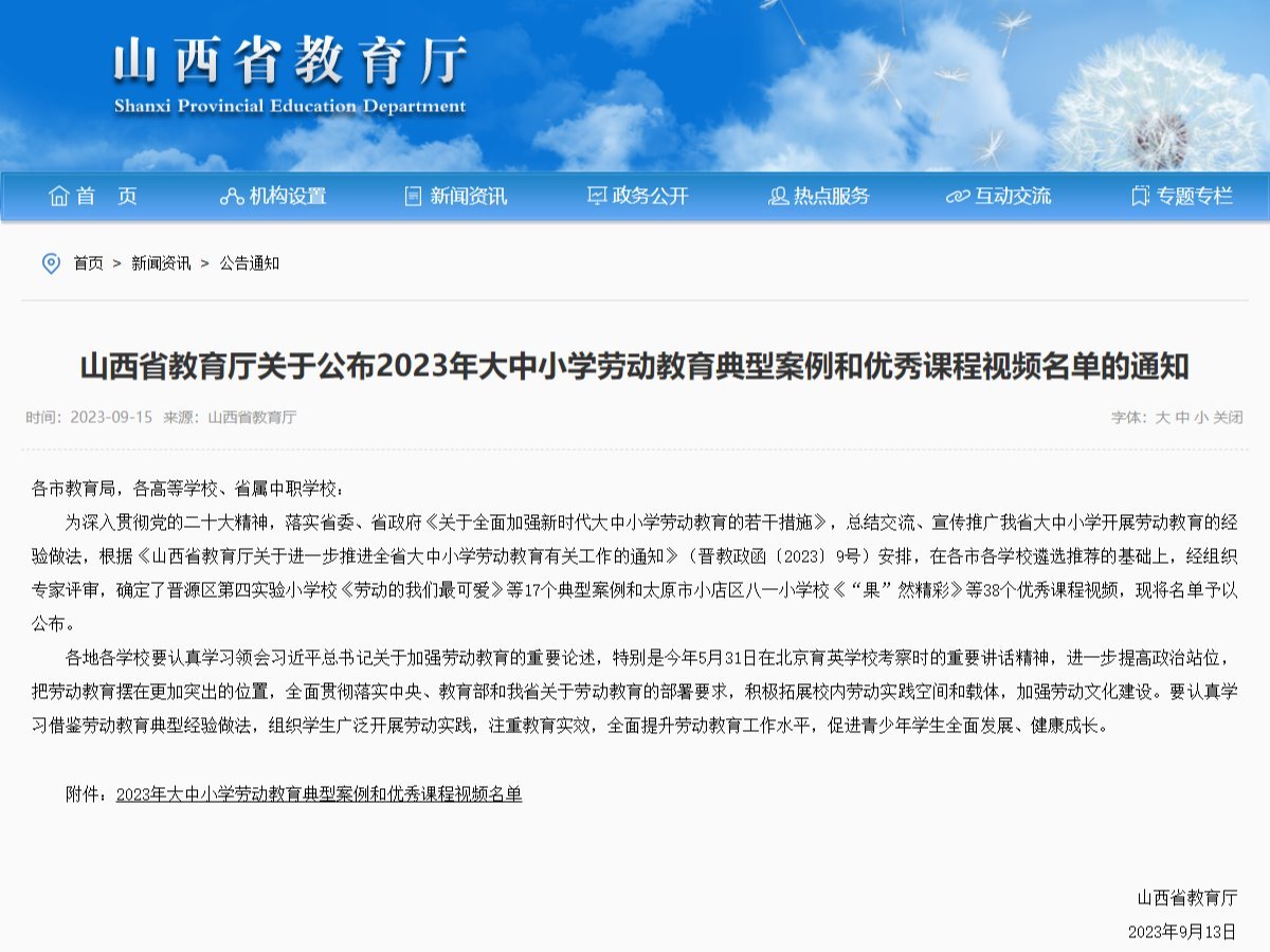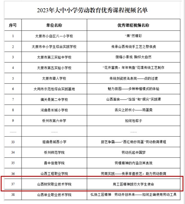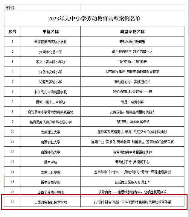 9月15日,省教育厅公布了2023年大中小学劳动教育典型案例和优秀课程视频名单。本次共有来自全省各地各校各个学段的17个典型案例和38个课程视频在评选中脱颖而出,其中职业院校共入围两个典型案例和三个优秀课程视频。我院上报的《以“四个融合”构建“1234”财贸特色新时代劳动教育体系》典型案例和《用工匠精神践行大学生使命》课程视频榜上有名。这是我院继今年3月获批首批省级大中小学生劳动教育实践基地以来在劳动教育领域的新突破。