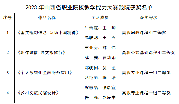 金秋9月,一年一度的省级职业院校技能大赛教学能力比赛落下帷幕。学院选送推荐的《坚定理想信念 弘扬中国精神》等5组作品荣获4个二等奖,并有《乡村文旅民宿设计》被山西省教育厅推荐参加2023年全国职业院校技能大赛教学能力比赛,获奖数量位居全省高职院校前列。至此,我校已连续六年在全省职业院校技能大赛教学能力比赛中获得优异成绩。