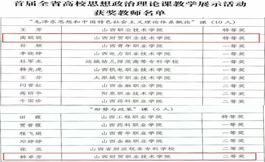 在首届全省高校思想政治理论课教学展示活动中,经过教案、说课视频的初评环节和现场教学展示的决赛环节,思政部教师高聪聪获《毛泽东思想和中国特色社会主义理论体系概论》课程特等奖、韩卓芳获《形势与政策》课程二等奖。