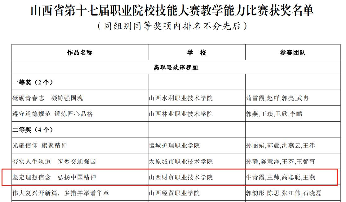 由牛青霞、王帅、高聪聪、王燕组成的教学团队,将《思想道德与法治》与现代物流管理专业相结合,以“坚定理想信念 弘扬中国精神”为主题,遵循“八个相统一”教学要求,围绕“传承丝路精神,培养新时代‘丝路人’”的目标,构建了“1237”交互式教学模式,打造的参赛作品《坚定理想信念 弘扬中国精神》在山西省第十七届职业院校技能大赛教学能力比赛中获高职思政课程组二等奖。