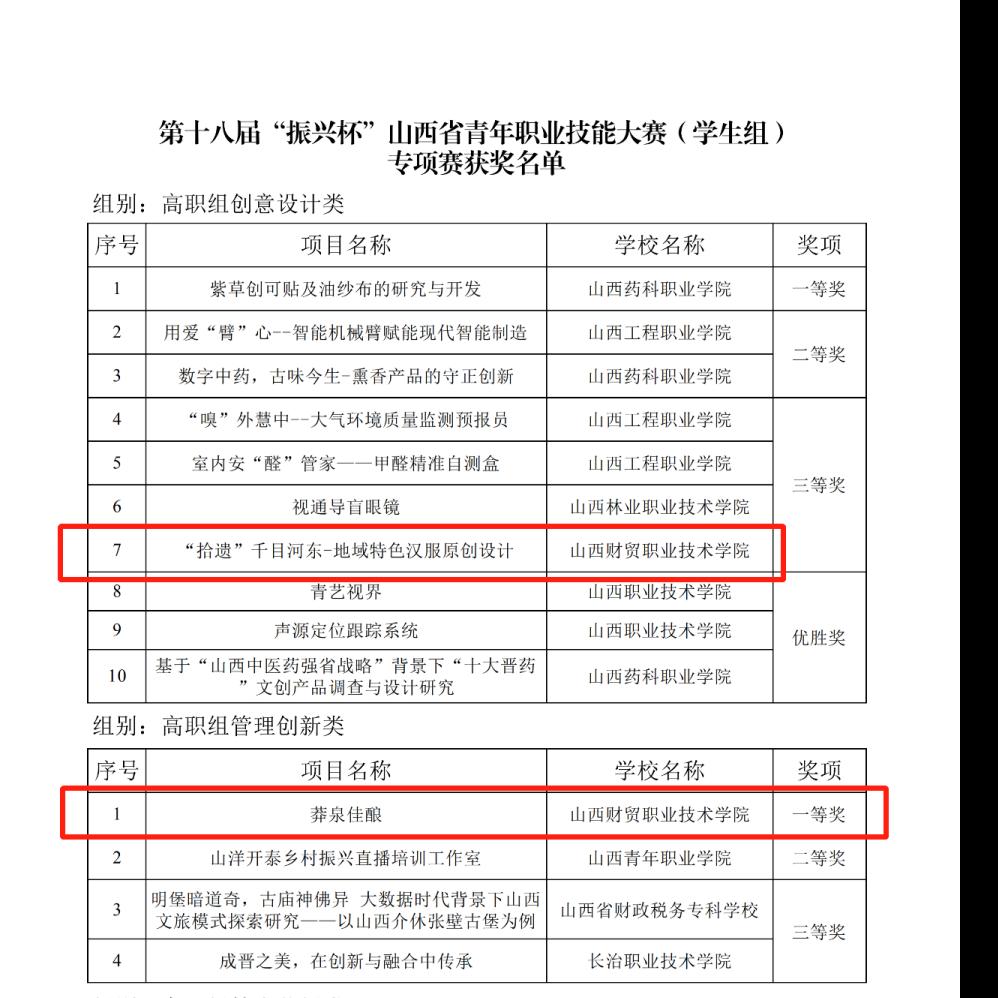 此次大赛以“踔厉奋发启新程、挺膺担当建新功”为主题,设专项赛、主体赛两项赛事,在收到大赛启动通知后,我院团委认真组织,积极动员,按照校赛评审成绩,共推送了5个项目参加省赛,其中3个项目脱颖而出,进入复赛环节。经过一天的现场答辩,高聪聪老师指导的《莽泉佳酿》项目荣获高职组管理创新类一等奖;姚溪溪老师指导的《“拾遗”千目河东-地域特色汉服原创设计》项目荣获高职组创意设计类三等奖。