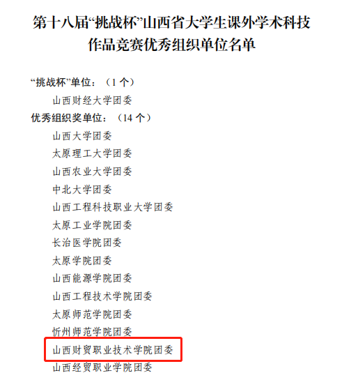 近日,由团省委、省教育厅、省科协、省社科院和省学联联合举办的第十八届“挑战杯”山西省大学生课外学术科技作品竞赛在山西财经大学圆满落幕。我院在此次比赛荣获二等奖一项、三等奖一项,院团委荣获“优秀组织奖”。