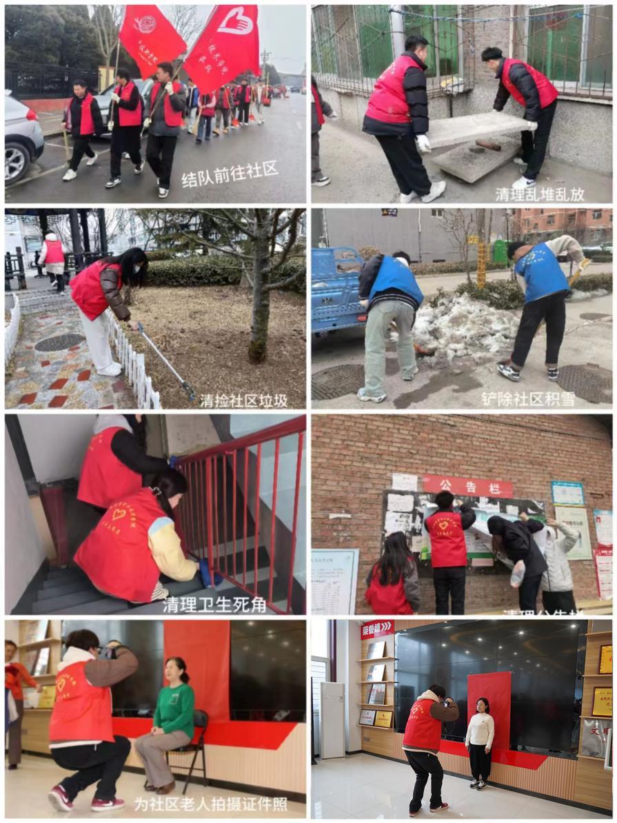 仪式结束后,各系团委书记和社区工作人员进行简单的座谈会,就如何利用专业优势更好地服务社区进行深入交流;星火志愿服务队在社区工作人员的带领下,兵分几路去往社区各地进行服务活动,在证件照拍摄角,摄影师们专业地引导爷爷奶奶们摆出自然的姿势,共计拍摄十余张证件照;环境保护区的志愿者们齐装上阵,按照区域分工,手拿铁锹、抹布、笤帚等工具快速投入社区“清洁战斗”,同学们热情高涨、干劲十足,共同打造整洁、文明的社区环境。