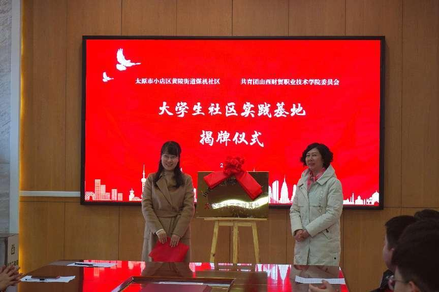 最后由太原市小店区黄陵街道煤机社区张玲芝副书记和山西财贸职业技术学院团委负责人冯春老师共同为大学生社区实践基地揭牌。