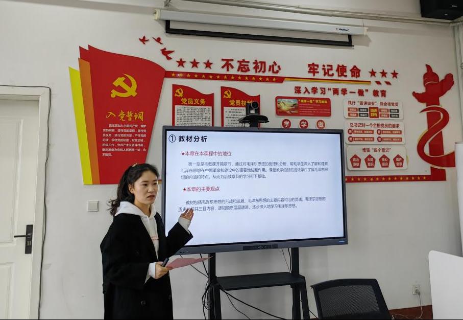 备课分两个环节进行,第一环节由张晓鹤老师结合毛泽东诗词对第一章“毛泽东思想及其历史地位”展开,从教材分析、学情分析、教学目标、教学重难点、教学方法、教学过程六个方面进行说课。第二环节由滑登红等四位老教师进行点评,四位教师分别从突破教学重难点、挖掘教学资源、结合毛泽东诗词打造概论课特色等角度进行了指导。