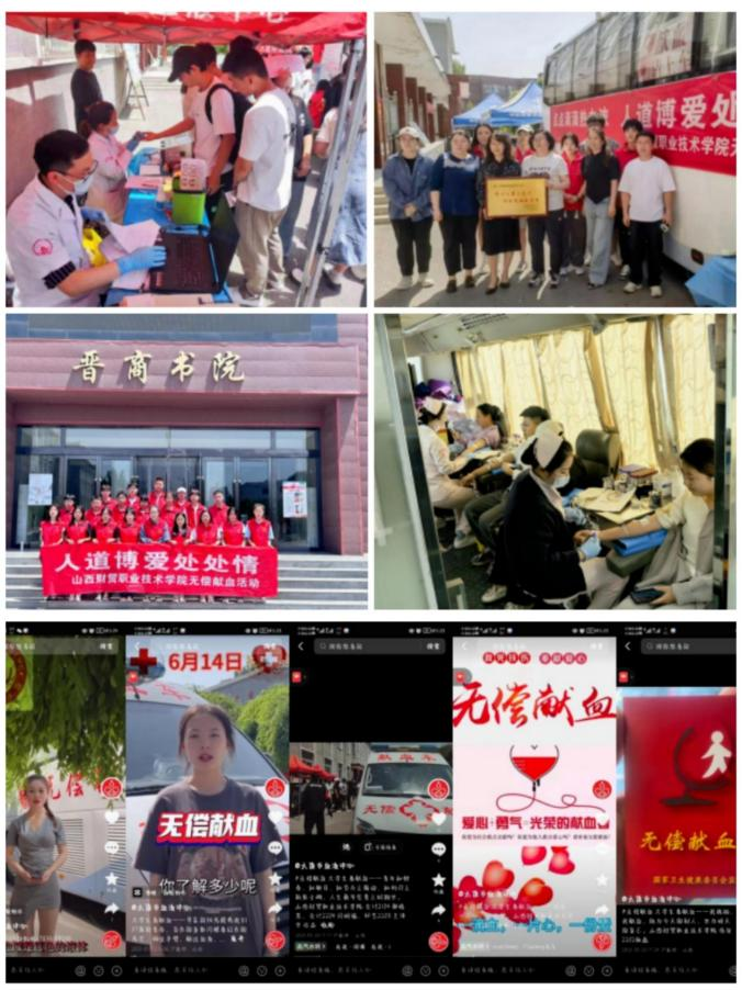 山西财贸职业技术学院青年志愿者协会联合太原市血液中心在2023年共开展两次公益献血活动,分别以“真爱涌动,爱心流淌”“汇聚青春正能量 无偿献血传爱心”为主题,并举办“我为青春献热血”主题短视频创作大赛。参与献血活动的师生共计585人,采集爱心血液221800ml,短视频创作大赛共收到38个创意短视频,视频形式多样,内容包含无偿献血科普知识宣传、身边感人的献血事迹、自身的献血记录等内容。生命呼唤血液,爱心需要奉献,这一系列活动充分体现财贸学子积极参与青春行动,在社会发展中积极作为、勇担使命的合格建设者形象。