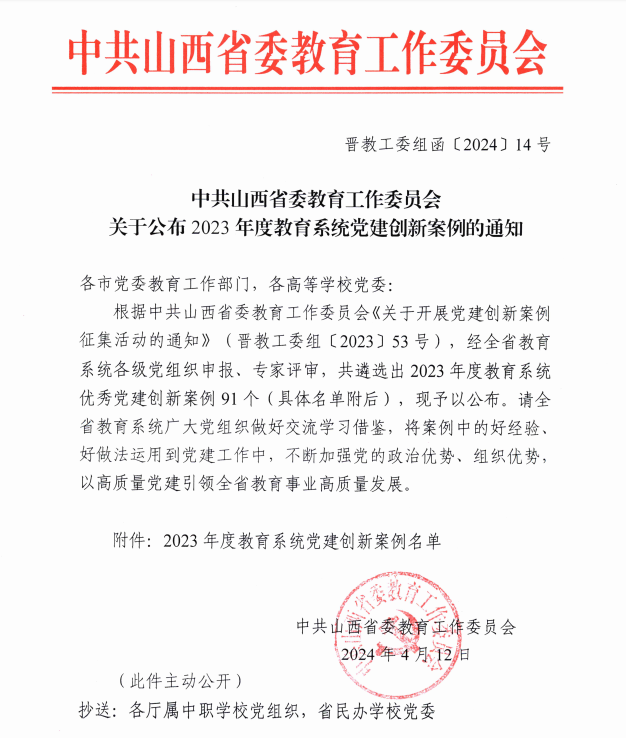 日前,中共山西省委教育工作委员会印发《中共山西省委教育工作委员会关于公布2023年度教育系统党建创新案例的通知》,公布了2023年度省教育系统优秀党建创新案例名单。其中,山西财贸职业技术学院文化旅游系旅游党支部申报的《思政育人“五个一”行动多维度凝聚师生合力》顺利通过评审,入选优秀党建创新案例。