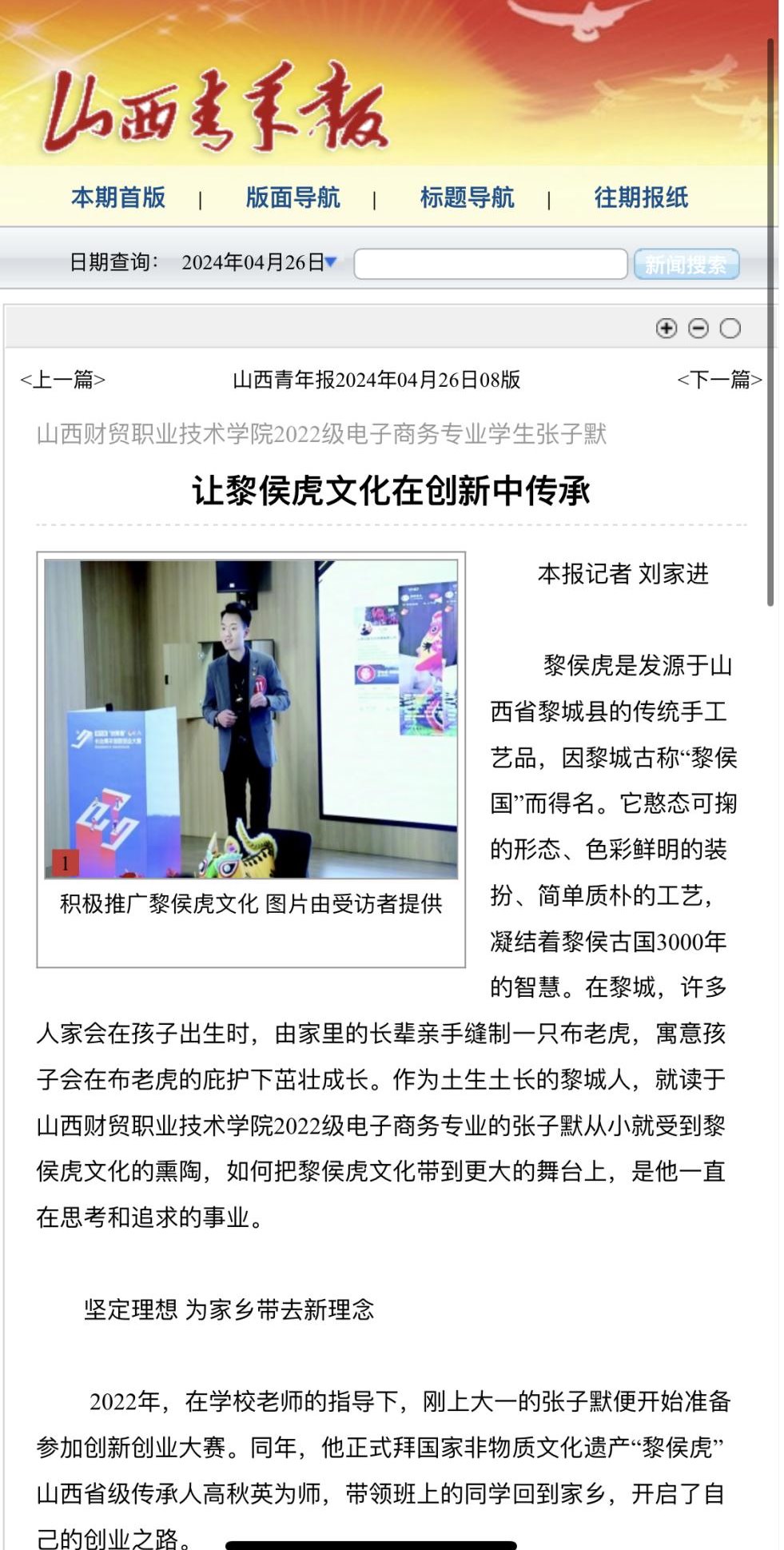 2022年,在学校老师的指导下,刚上大一的张子默便开始准备参加创新创业大赛。同年,他正式拜国家非物质文化遗产“黎侯虎”山西省级传承人高秋英为师,带领班上的同学回到家乡,开启了自己的创业之路。
