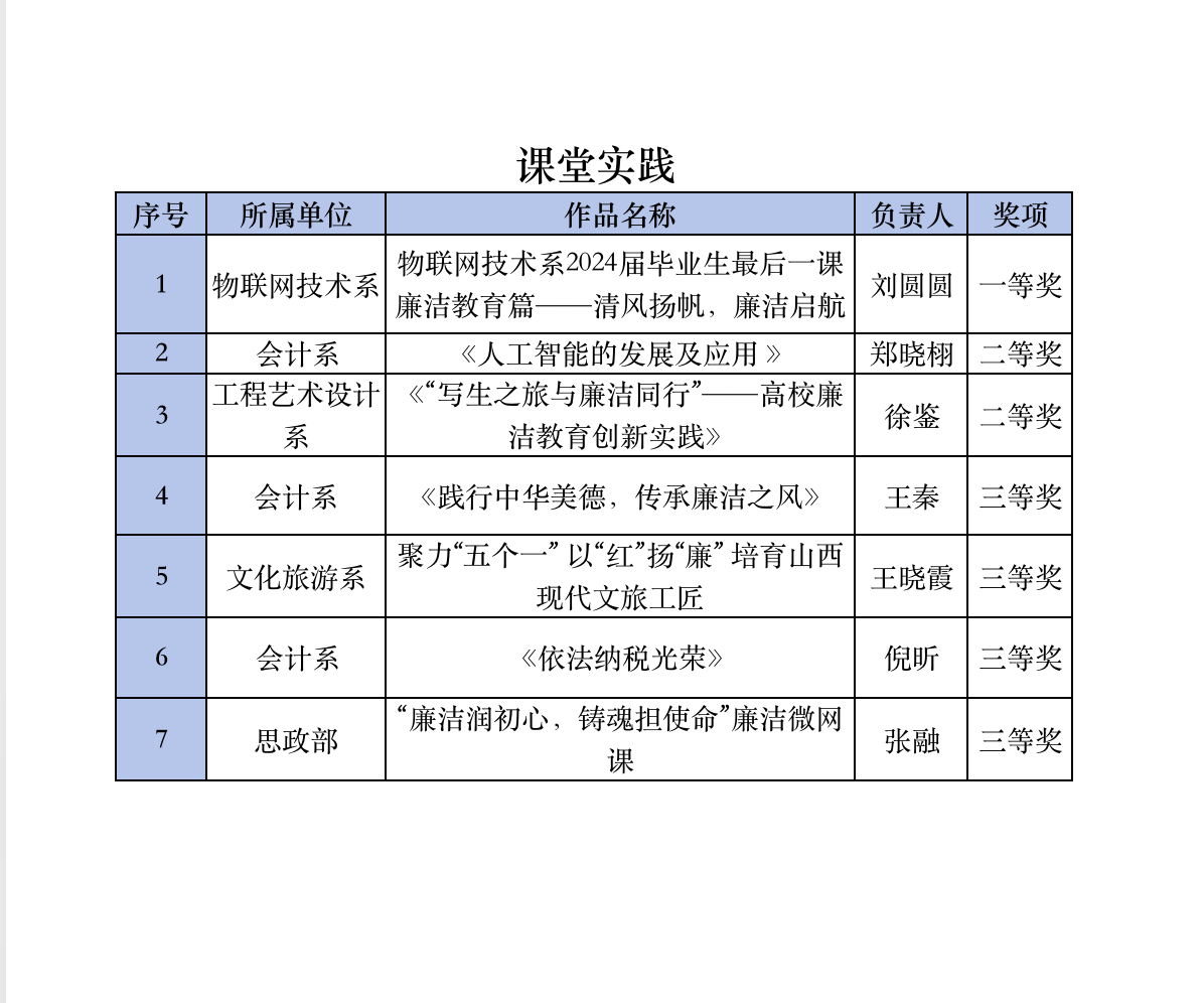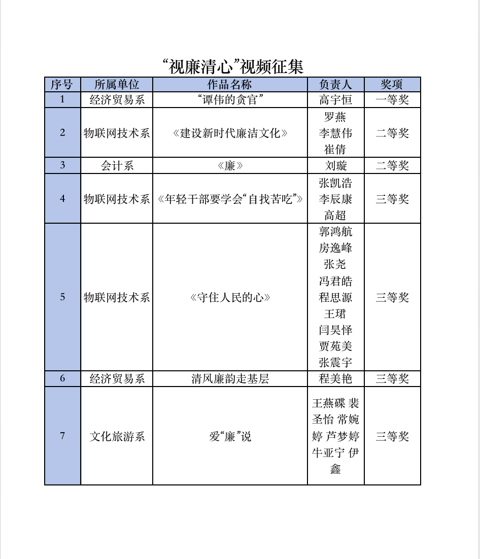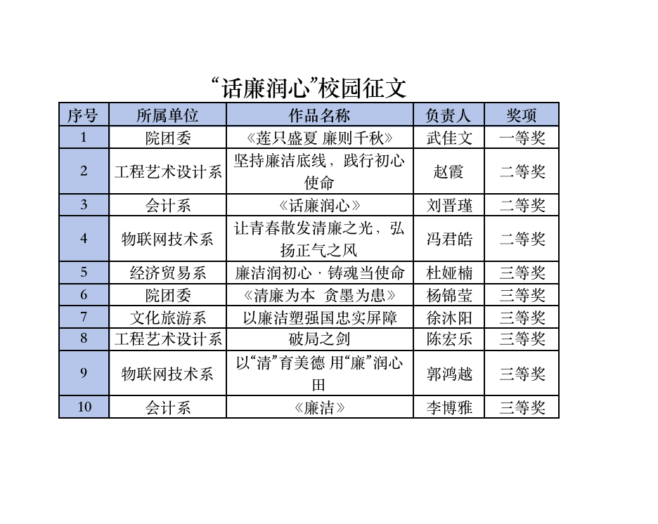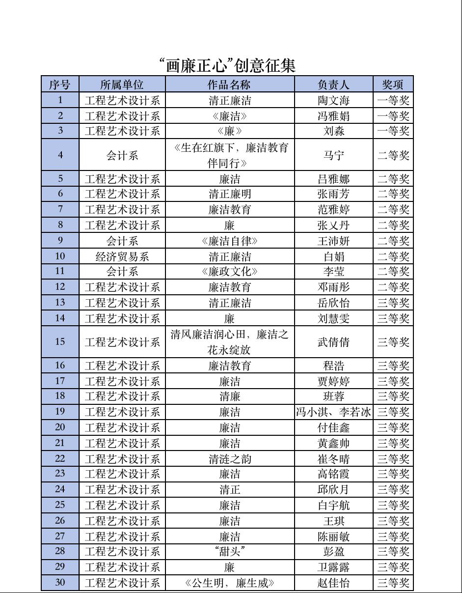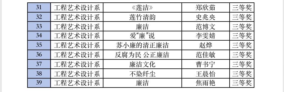 在此次活动中,从各类作品中共评选出一等奖6名,二等奖16名,三等奖41名,获奖作品紧扣时代主题、聚焦廉洁典型、放眼历史长河、挖掘文化基因,主题鲜明、创意新颖,在作品中中涵养尚廉崇德、持廉守正的精神境界,为培养堪当民族复兴大任的时代新人营造风清气正育人生态。具体获奖情况见下表: