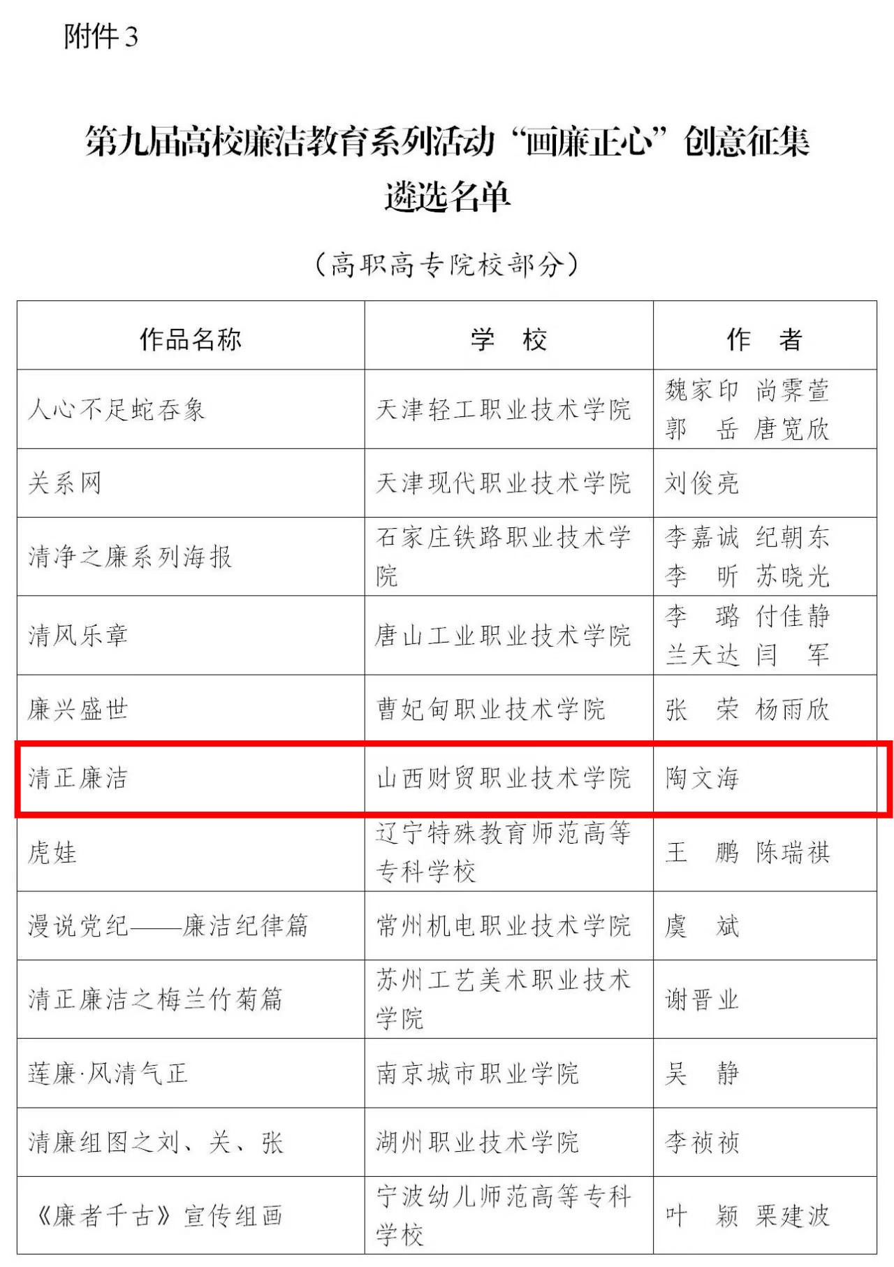 日前,教育部发布《关于第九届高校廉洁教育系列活动结果的公示》,山西高校共荣获12个奖项,我院工程艺术设计系广告2204班陶文海的作品《清正廉洁》成功入选“画廉正心”创意征集活动遴选名单。