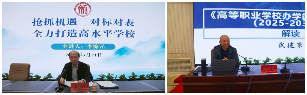 为提升学习研讨的针对性和前瞻性,学院邀请山西工程科技职业大学副校长李锦元、山西工程职业学院职业教育研究所所长武建京两位专家作专题讲座。两位专家围绕学院战略规划、“双高”建设、产教融合、高等职业学校办学能力评价等主题,结合教育强国、教育强省建设规划纲要,进行深入剖析解读,为学院发展提供了极具价值的建设思路和方向。