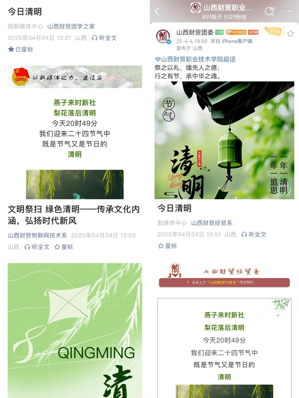 学院各级团组织充分发挥新媒体平台优势,向广大师生传递绿色、文明、安全、节俭的祭祀理念,积极营造“移风易俗过清明,文明祭祀寄追思”的良好氛围。