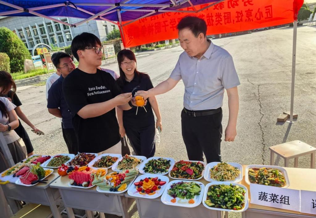 比赛期间,学院党委副书记张合义亲临现场指导,与参赛学生亲切交谈,了解作品制作流程、食材选取等细节,并对选手们精湛技艺和创意表现予以高度评价。